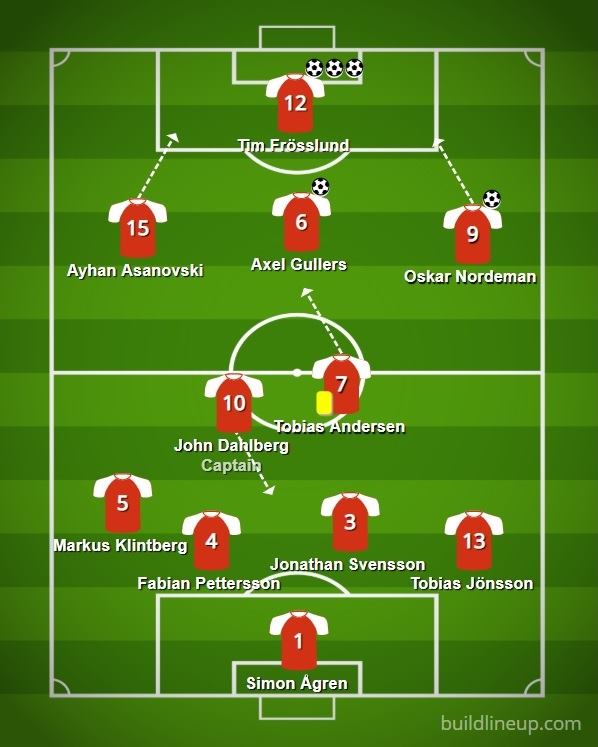 passning till en fräsch Söderström. Söderström spelar in den på Tim som gör sitt tredje mål.